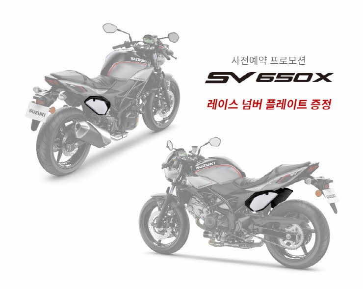 SV650X ABS 사전예약 프로모션은 1월 2일부터 2월 28일 까지 약 2달간 진행되며, 기간 내에 전국 스즈키 판매점을 통해 계약을 완료한 고객에 한정하여 46만원 상당의 프레임 커버 키트를 증정한다.