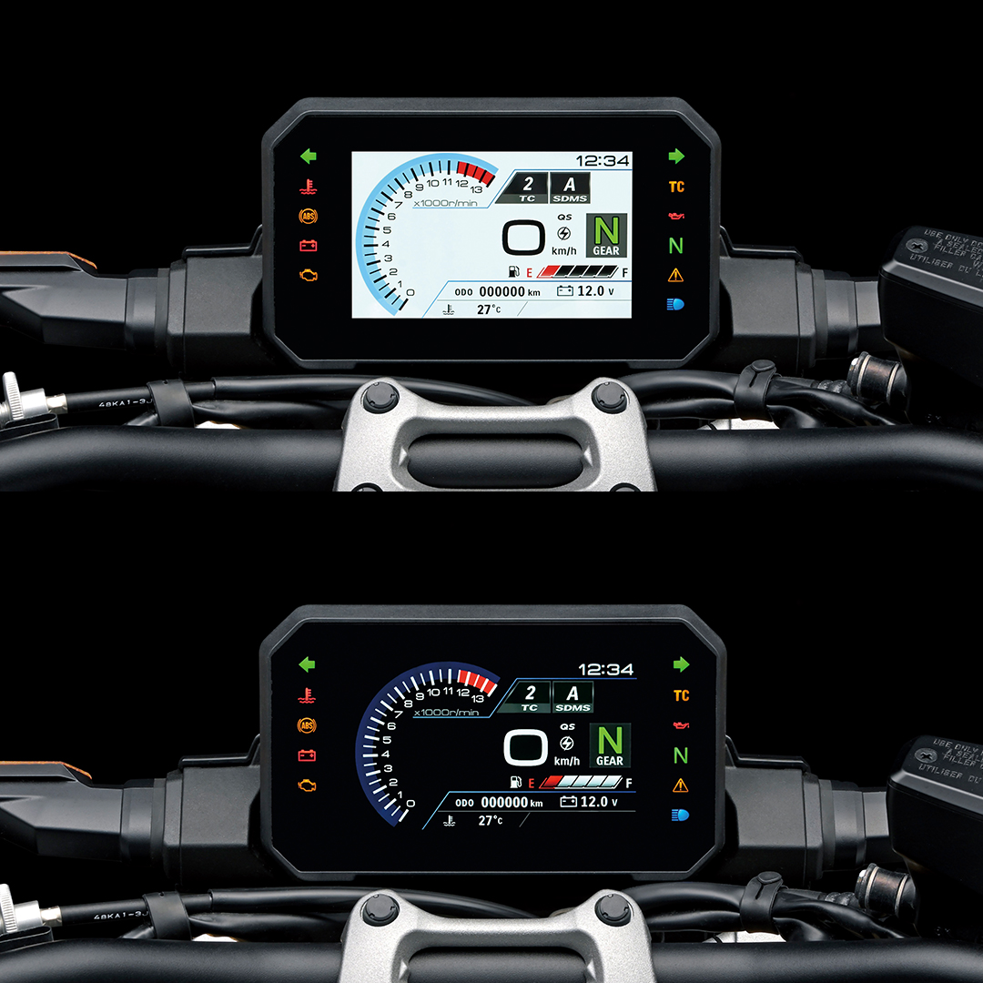 새로운 5인치 사이즈의 컬러 계기판은 낮에 선명한 화이트, 밤에 강렬한 블랙으로 자동 전환되어 언제나 완벽한 시인성을 보장합니다. RPM, 속도, 기어, 트랙션 컨트롤까지 모든 정보를 한눈에, 단 한 번의 시선으로 파악할 수 있는 직관적 레이아웃. 디지털 기술과 감각적 디자인이 만난 이 계기판은, 라이더의 한계를 확장시키는 새로운 기준이 됩니다.